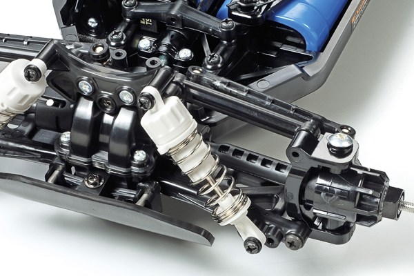 Det akseldrevne 4WD TT-02B buggychassis har en skridformet ramme. Dens affjedringsopsætning bruger 4-hjuls uafhængig dobbelt bærearmsaffjedring med lange arme, plus hvide CVA oliechok-enheder, hvilket giver bilen sikker håndtering, mens venstre/højre affjedringsarme og stolpere er identiske for at lette problemfri montering. For-/baggearkasser inkluderer 4-fasede differentialer for jævn drift og er forseglet for at sikre, at støv ikke kan trænge ind.