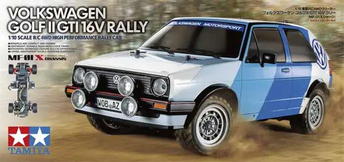 1/10 R/C Volkswagen Golf A2 Rally (MF-01X)Rallybiler er altid et spændende emne, der præsterer godt både på asfalt og flad jord, og Tamiya er glade for at annoncere tilføjelsen af endnu en til vores R/C kits: Volkswagen Golf MK2, der fremstiller en bil, som blev mester i A7-klassen i det globale rallyløb i 1986. (Gruppe A er for biler med over fire sæder, som havde en produktion på over 2.500 i løbet af på hinanden følgende 12 måneder, og A7 betød biler, som havde motore på 1.601 – 2.000cc.)Denne bil blev drevet af en 1.781cc inline 4-cylindret 4-takts benzinmotor med en kapacitet på 195 hk.Om modellen:
