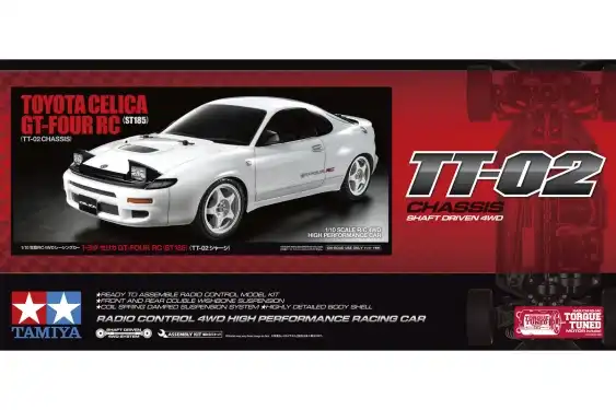 1/10 R/C Toyota Celica GT-Four RC (ST185) (TT-02)Tamiya er glade for at kunne annoncere fremkomsten af endnu en klassisk racerbil på vores populære TT-02 chassis, denne gang Toyota Celica GT-Four RC (ST185).Toyota Celica GT-Four RC blev udviklet som en homologationsbil for at deltage i globale rallyløb, og i 1992 blev der solgt 5.000 enheder over hele verden. Med sin buede, kraftfulde karrosseri, anvendte denne bil en 2-liters turbomotor med metal-turbiner og et vandbaseret intercoolersystem, som var i stand til at yde 235ps. 4WD-systemet benyttede en centrisk viskøs kobling og et Torsen-differentiale bagtil for overlegen kontrol og trækkraft.I de globale rallyløb i 1993 førte Celica GT-Four (ST185) Toyota til deres første sejr både i fabrikanternes og kørernes mesterskaber.Toyota Celica GT-Four RC (ST185) vandt 16 fulde WRC-serier og 3 samlede sejre i W2L-serien. WRC kørertitler med Carlos Sainz fra Spanien i 1992, Juha Kankkunen fra Finland i 1993, og Didier Auriol fra Frankrig i 1994. WRC fabrikanttitler i 1993 og 1994.Om Modellen