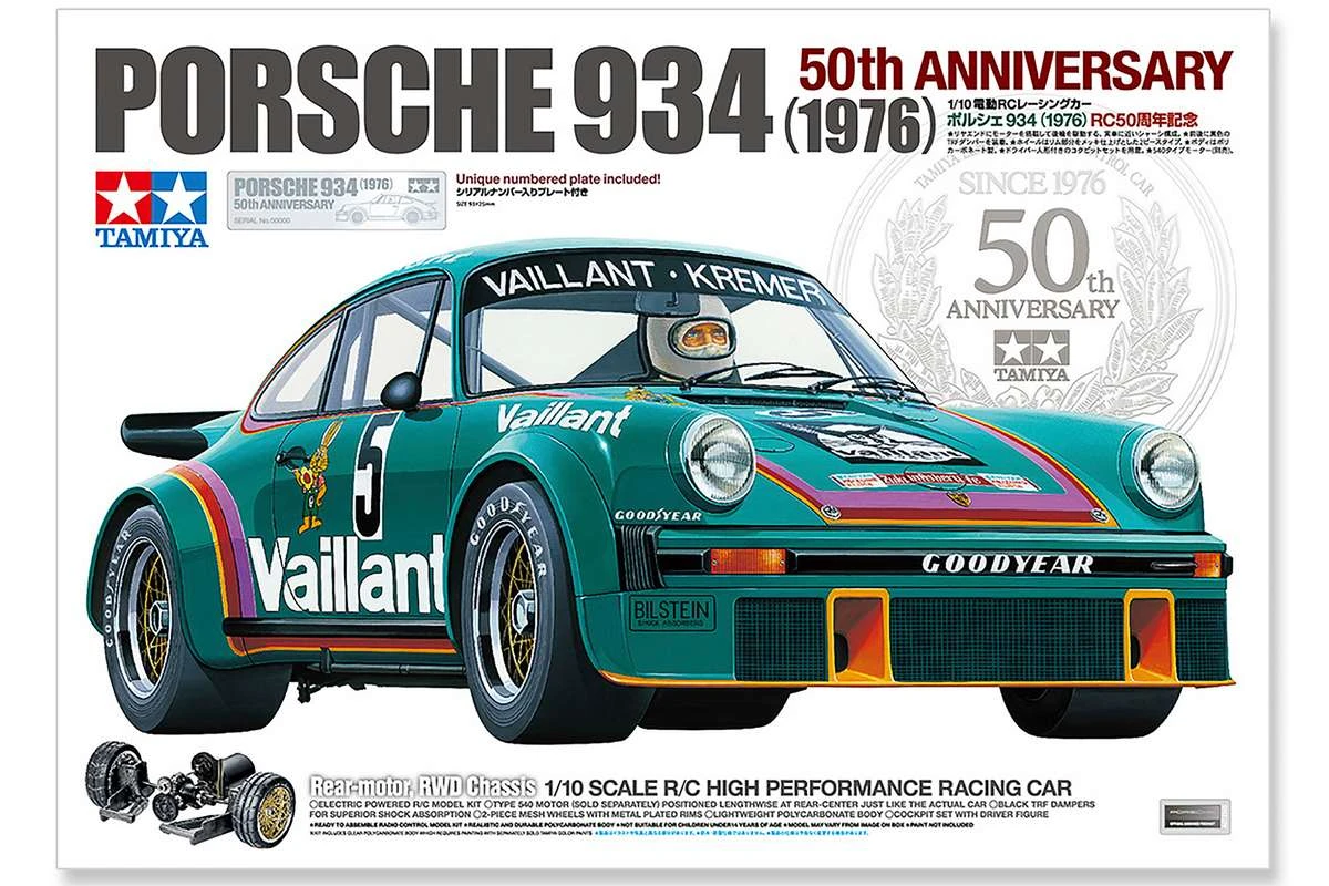 TAMIYA 1/10 R/C Porsche 934 (1976) 50th Anniversary Samlesæt. ( Forudbestil den nu, så du er sikker på at få en. )