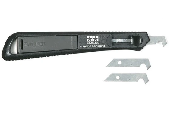 Tamiya’s originale smalle klinge i wolframstål giver nem adgang til steder, der er svære at nå. Klingen kan trækkes sikkert ind i håndtaget, når den ikke er i brug. Der medfølger to udskiftelige reserveklinger.